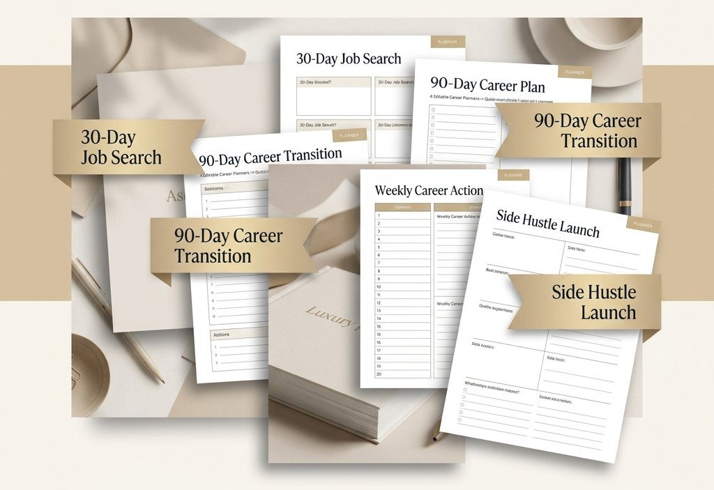 Whether you are actively job searching, planning a career transition, trying to stay consistent with weekly career actions, or launching a side hustle, this bundle gives you polished planning tools you can actually use.