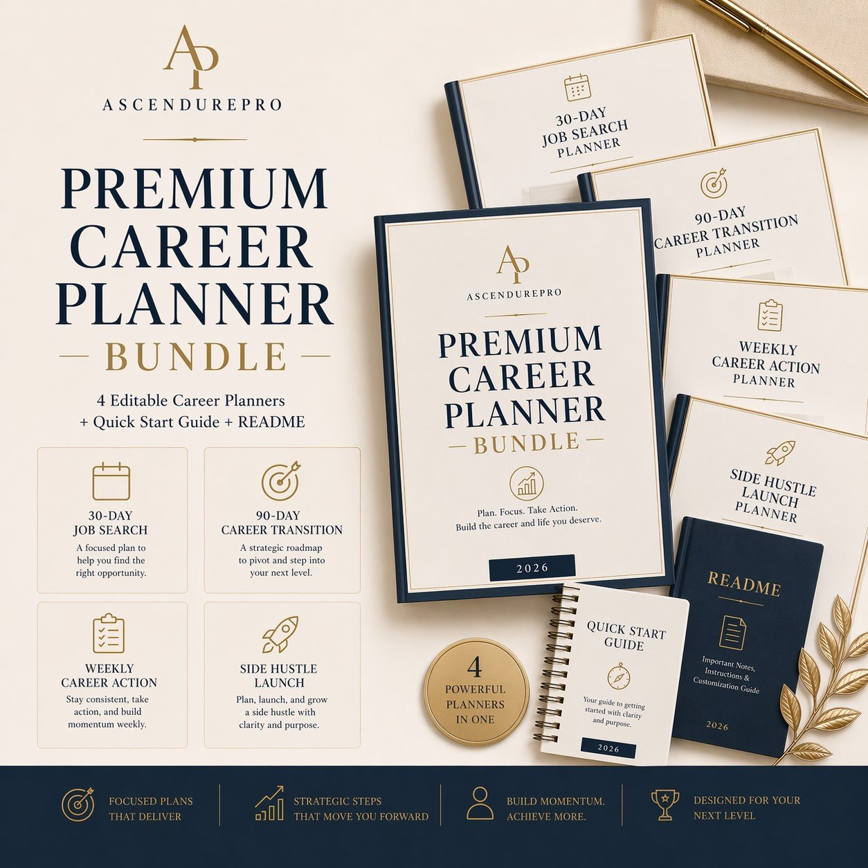 The Premium Career Planner Bundle by AscendurePro is a high-value digital toolkit designed to help professionals organize career goals, plan key transitions, and move forward with more clarity, structure, and consistency.