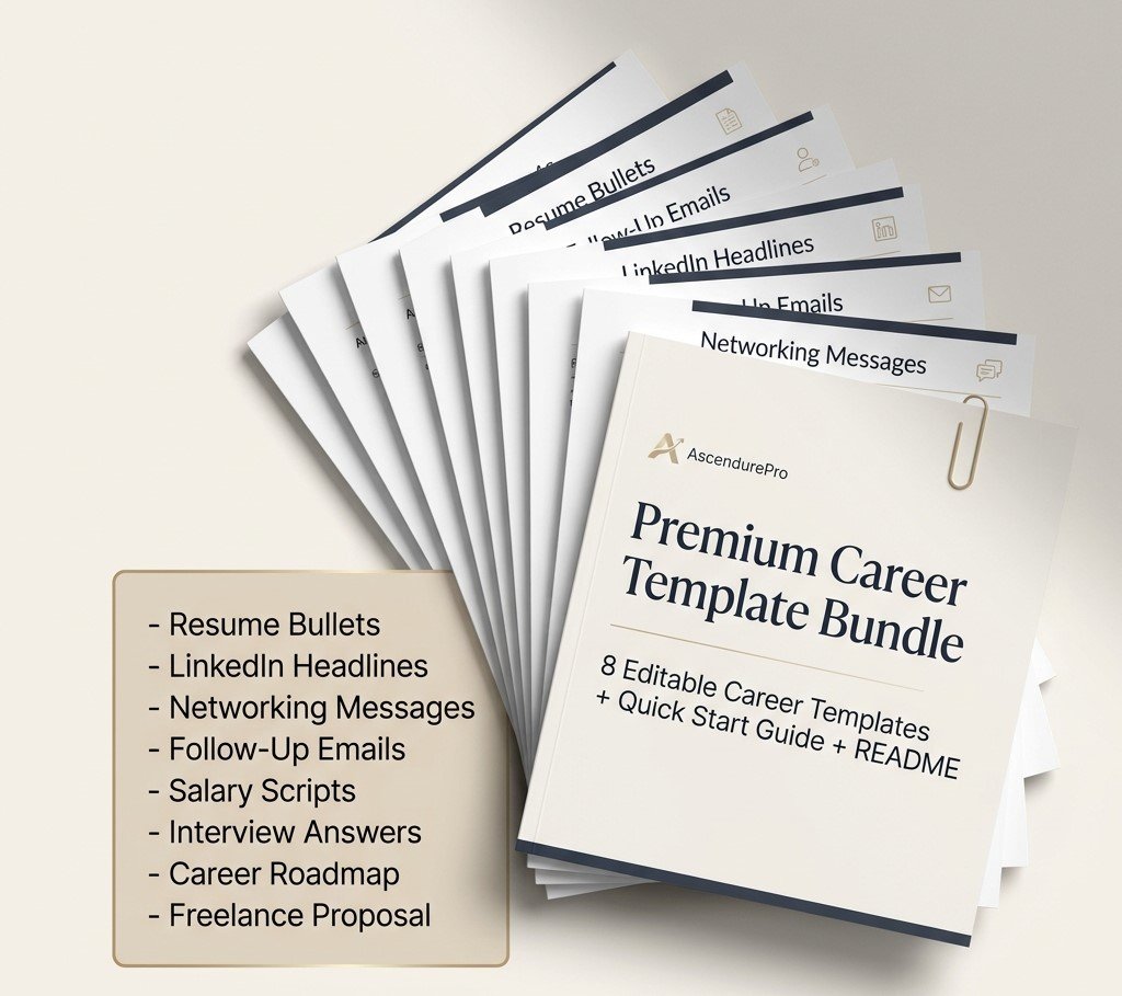 The Premium Career Template Bundle by AscendurePro is a high-value digital toolkit designed to help professionals communicate more clearly across key career moments — from resumes and LinkedIn to networking, interviews, salary negotiation, and freelance proposals.