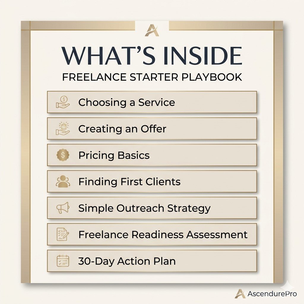 The Freelance Starter Playbook by AscendurePro is a premium digital guide designed to help professionals turn their skills into a freelance income stream with more clarity, structure, and confidence.