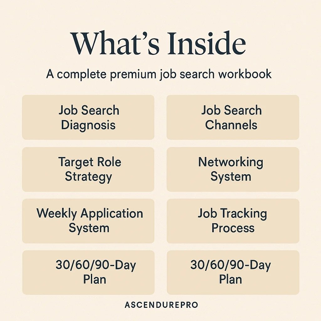 The Job Search Strategy Playbook is a premium guided workbook designed to help job seekers run a more focused, organized, and effective search so they can find and land opportunities faster.