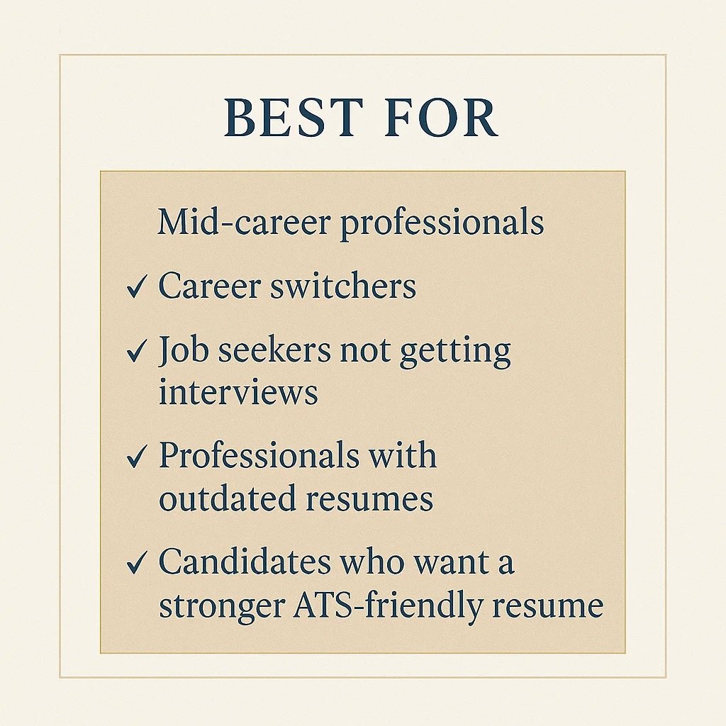 Whether you are a mid-career professional, a career switcher, or a job seeker struggling to get interview responses, this workbook gives you a practical system to rebuild your resume with more clarity, stronger positioning, and better results.