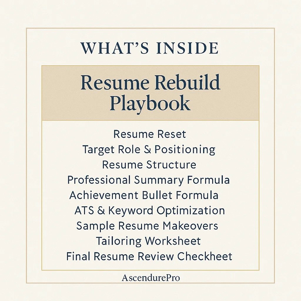 The Resume Rebuild Playbook is a premium digital guide designed to help professionals turn a weak, outdated, or unfocused resume into a modern, strategic, interview-winning document.